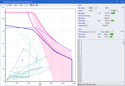 The Motor Torque chart displays the field weakening area of operation in a shaded region, helping users "see" where the motor is operating in field weakening mode.