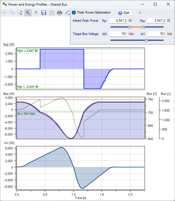 Supply Peak Power Optimization minimizes the Supply Peak Power in Shared Bus applications by finding the best balance of energy storage, bus voltage range values [Vt0 - Vt1], and supply [Pps] and regen [Ppr] power limits.