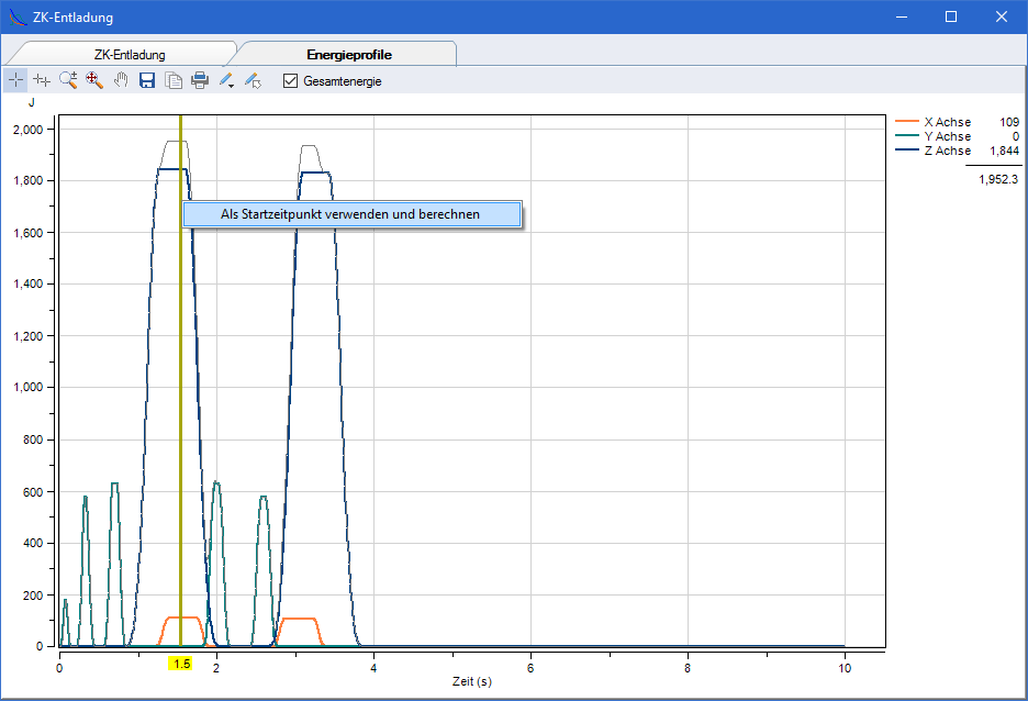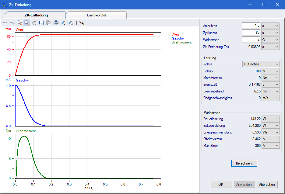 Das Schaubild unten zeigt die Energieprofile für alle Achsen. Bei gemeinsam genutzten Zwischenkreisanlagen wird auch das Energieprofil der Gesamtanlage (das hellgraue Profil) dargestellt, was dem Anwender hilft, das Szenario des schlimmstmöglichen Falls zu ermitteln. Platzieren Sie die Fadenkreuzlinie auf dem gewünschten Zeitpunkt des Durchgangs, dann führen Sie einen Rechtsklick aus und wählen Sie "Als Startzeitpunkt verwenden und berechnen“. Die Zwischenkreis Entladung berechnungen werden ausgeführt und anschließend werden die Zwischenkreis Entladung profile angezeigt.