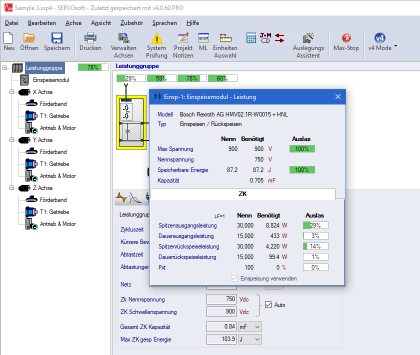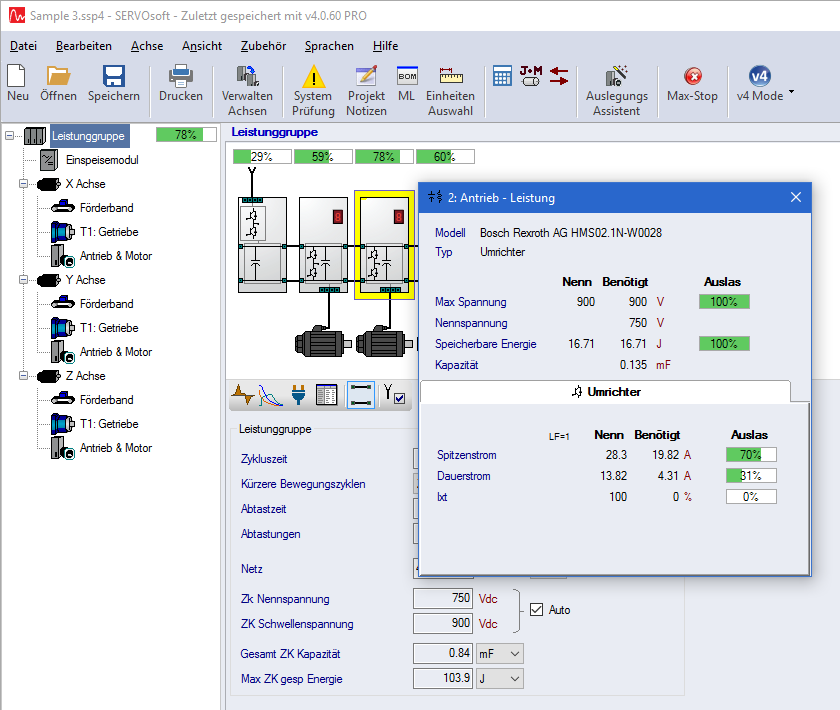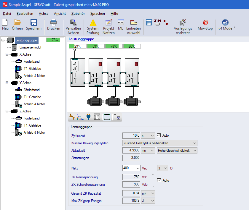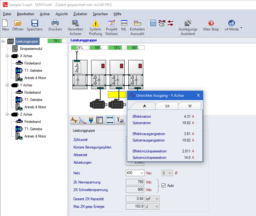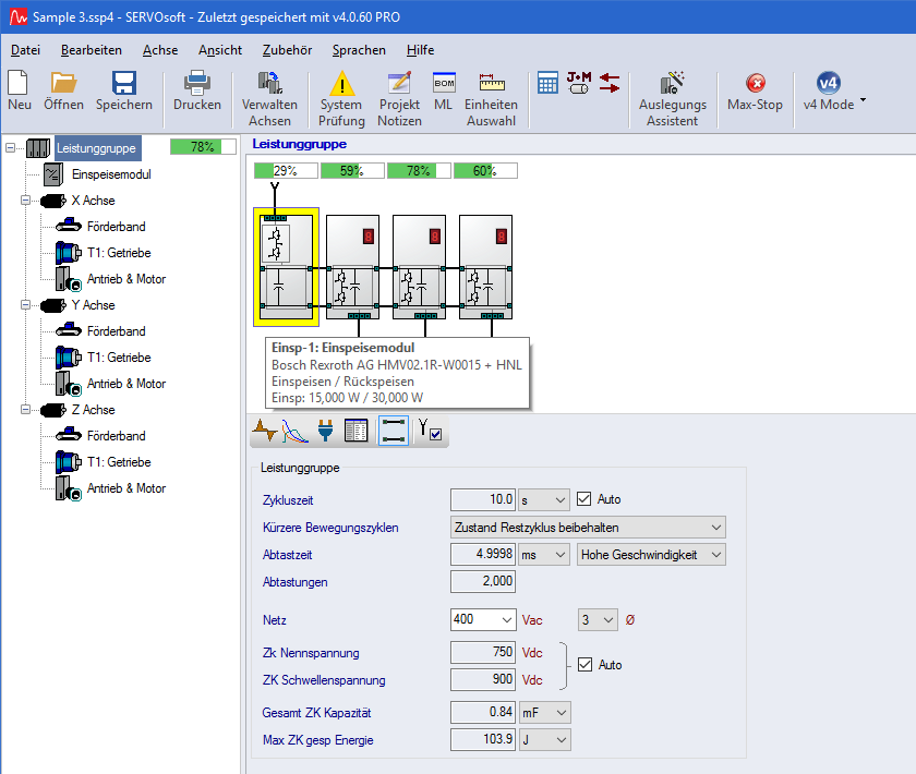 Klicken Sie auf eine beliebige Komponente, um die entsprechenden Leistungsdaten anzuzeigen. Zur Illustration hier wird das unten gezeigte Beispielprojekt verwendet, das aus einem Einspeisemodul mit Generator und drei Umrichtermodulen besteht.