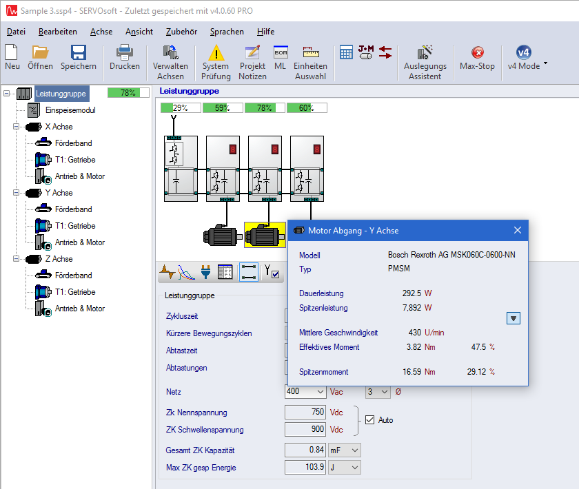Wenn Sie auf die Darstellung des Antriebs klicken, wird der dazugehörige Eigenleistungsfluss angezeigt.