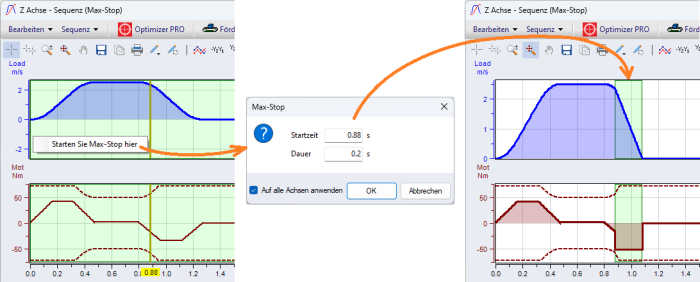 Wählen Sie den Max-Stop Modus (=Emergency Stop, Nothalt) um eine Max-Stop Sequenz im gleichen Projekt wie die Antriebsauslegung zu erstellen. Die Max-Stop Sequenz ist eine zusätzliche Sequenz zur Hauptsequenz im Projekt mit einigen wichtigen Unterschieden.