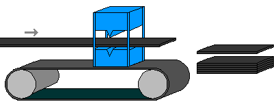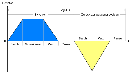 Die Fliegende Schere Vorlagen erzeugt in typischen Anwendungen einen Arbeitsgang, bei dem Materialstreifen aus einer langen Materialrolle geschnitten werden. Das Material wird mit einer konstanten linearen Geschwindigkeit abgewickelt und die Streifen werden unter Verwendung einer fliegenden Schere (eines auf einen Schlitten montierten Messers) abgeschnitten. Wenn der Schnitt erfolgt, muss sich die Schere mit derselben Geschwindigkeit bewegen wie das Material zum Zeitpunkt des Schneidens (der Zeit, die die Schere benötigt, um den Schnitt vorzunehmen). Nach dem Schnitt wird die Schere angehalten und in ihre Ausgangsposition zurück gefahren.