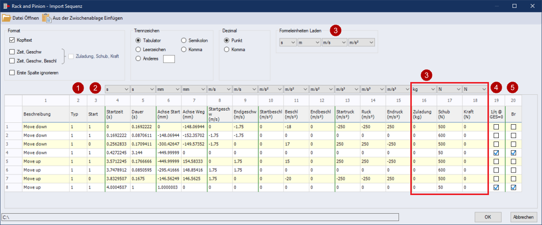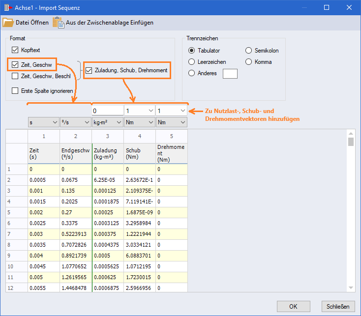 Zeit und Weg oder Zeit und Geschwindigkeit sind generische Methoden, um praktisch jede dynamische Bewegungsprofil als Sequenz importieren, wie unten gezeigt. Mit diesen Methoden gibt es auch die Option Zuladung, Schub, Drehmoment, die drei weitere Spalten enthält, um benutzerdefinierte dynamische Last-, Schub- und Drehmomentprofile aufzunehmen.