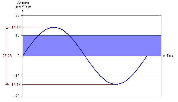 Die Effektivangabe bezieht sich auf die Leistung, die mit dem Strom erbracht werden kann. Bei bürstenlosen Sinusmotoren beträgt der effektive Nennwert 70%, (1/√2) des maximalen Stromnennwerts. Demnach könnte ein Umrichter mit 10 A effektivem Dauerstrom mit 28,28 A maximaler Spitzenleistung (10A x √2 x 2 = 28,28A) eingestuft werden, obwohl beide Antriebe die gleiche Menge Strom erzeugen. Die software verwendet den eher zurückhaltenden Nennwert von 10 A Effektivstrom, was ist der "effektive" Wert, der bei Servomotorherstellern am häufigsten zum Einsatz kommt. Das folgende Diagramm erläutert die Unterschiede: