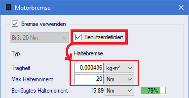 Wenn "Benutzerdefiniert" markiert ist, die Bremse Trägheit und max Haltemoment manuell eingeben.