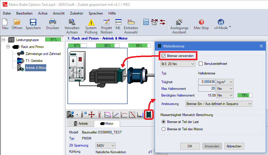 Wenn "Bremse verwenden" aktiviert ist, wird die Motorbremse aktiviert und das Brems Bild wird mit dem Motor gezeigt. Die gezeigten Bremse Trägheit und max Haltemoment-Werte sind aus der Motordatenbank für den ausgewählten Motor.