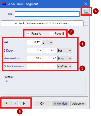 Hier werden die Daten für Druck und Volumenstrom in einem Segment eingegeben.
