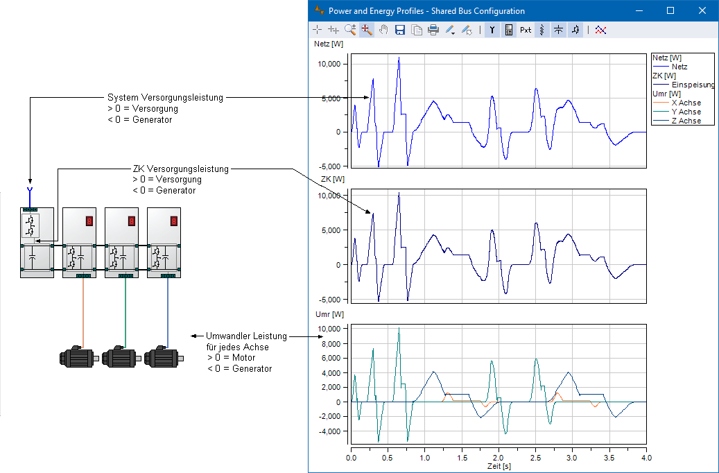 Hier ein Beispiel für eine typische 3-achsige Portalroboteranwendung in einer gemeinsamen Zwischenkreis-Konfiguration mit folgenden Merkmalen: