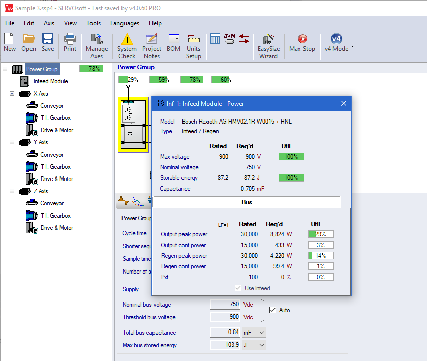 Click on any component to view its performance details. Consider the sample project below consisting of an infeed module with regenerative capability, and three inverter modules.