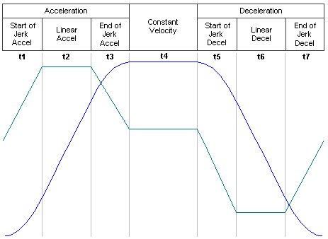 Modified Trapezoidal Accel | 2.000 d/t | 4.888 d/t² | 61.4 d/t³ | Low accel, but rough jerk |