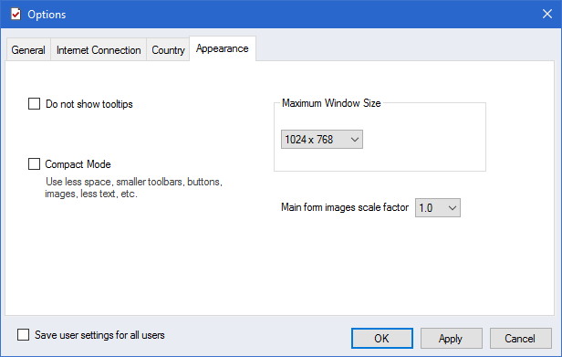 The 'Appearance' tab allows users to specify if they want to see the tooltips when hovering over an item, the maximum window size and change the image scaling. These features are of particular interest to those who perform training using a projector as well as those who create training videos.