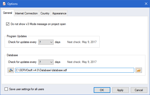 The 'General' tab allows users to configure if they want to see the v3 Mode warning message each time a v3 project is opened. The program and database updates check frequency is also specified as well as the path to the active database file. The database file can be on a local drive or a network drive.