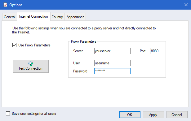 The 'Internet Connection' tab allows users to configure the proxy server parameters if they are located behind their company proxy server. Speak with your IT person to obtain the needed parameters.