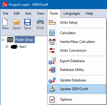 The program will prompt the user for a program update at regular intervals as specified in the Program Update Check Interval under 'Tools > Options'. Program Updates can also be made any time by selecting the drop down menu at 'Tools > Update SERVOsoft'.