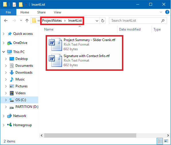 Inside the default 'ProjectNotes' folder is the 'InsertList'