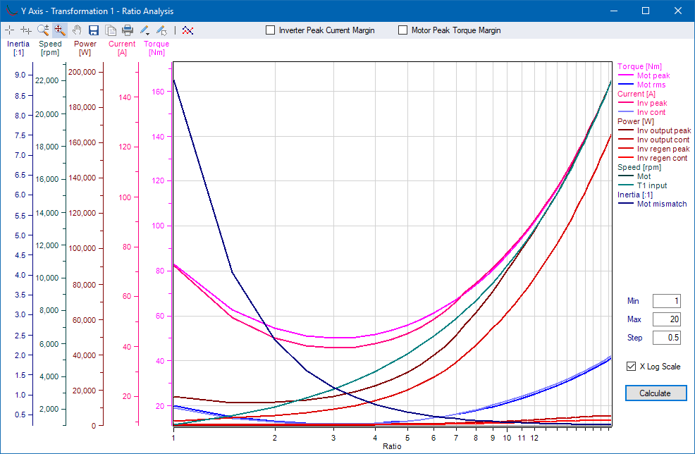 Enable either one or both of the 'Inverter Peak Current Margin' and 'Motor Peak Torque Margin', and shaded areas will appear showing which ratios exceeded those limits. Therefore, what remains unshaded are the ratios that operate within the drive inverter peak current margin and the motor peak torque margin. In the example below, those valid ratios are 1.5 to 3.5.