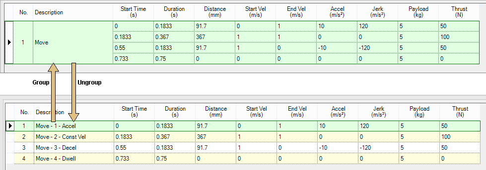 The Ungroup function breaks up a move into four segments - Accel, Constant Velocity, Decel and Dwell. Ungrouping allows for the editing of the individual segments.