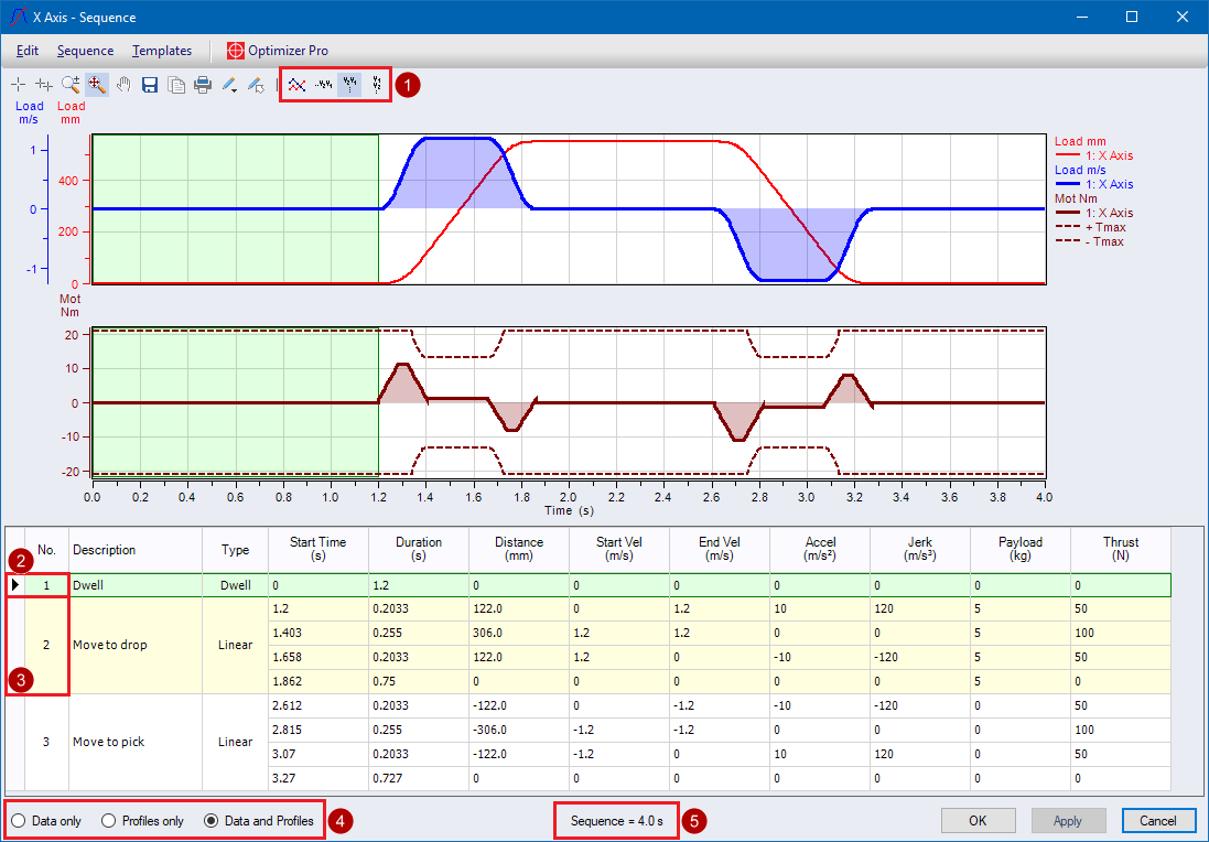 The Sequence form illustrates all move profiles within the cycle, referred to as the sequence of an axis. To coordinate between the timing of other axis moves, you may chart up to 6 profiles, from any axis, using the Configure Profiles form.