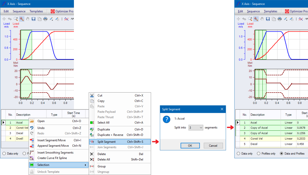The Split Segment feature splits the selected segment into N equal segments that equal the total distance and duration of the original segment. Poly 3/5/7 order segments are split into a continuous N segment spline. All other profile types, a Linear profile type with no jerk is used. Ie. A straight line.