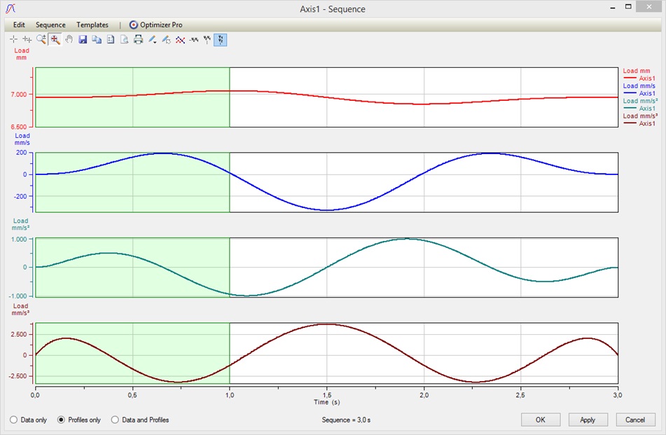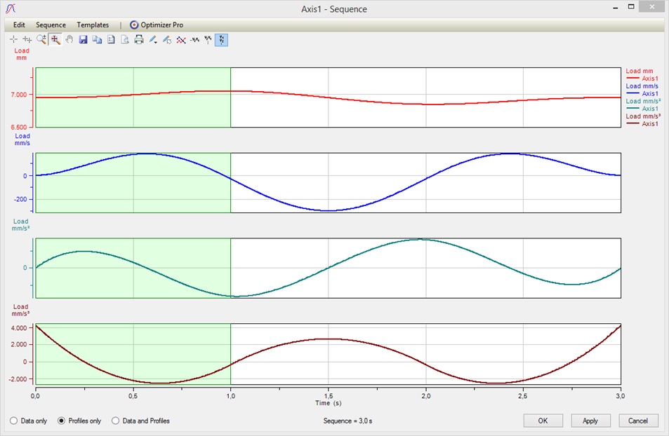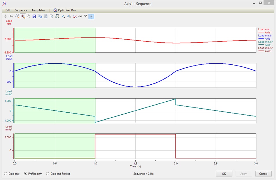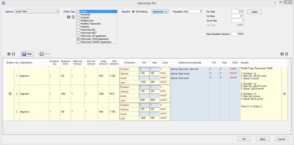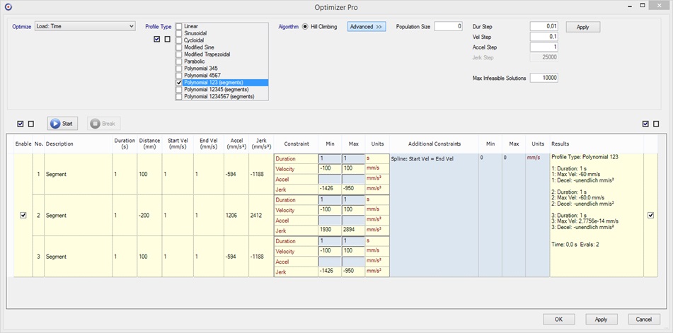 So when looking at the profiles we see that we have an acceleration jump at each junction of the 3 segments. This is because the polynomials are uniquely defined by the set variables above. Now in order to get rid of the acceleration jumps we usually would start playing with the Start/End Velocities at the junction points and this might be an annoying task to do manually.