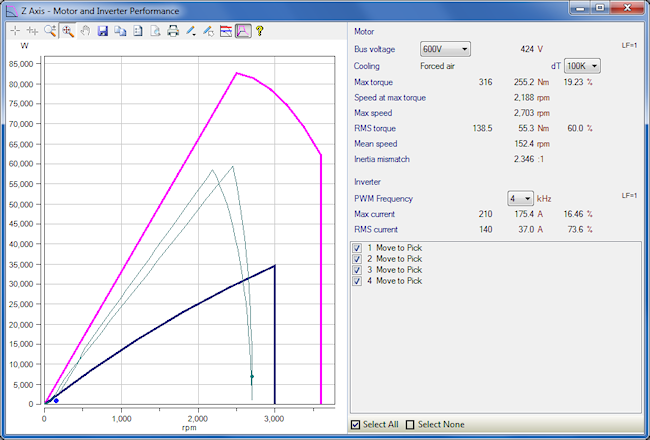 So in this application, what is clearly illustrated in the Motor Power vs Speed chart is the 60kW of mechanical peak power. The S-curve motion profile has many advantages, but depending on the available infeed modules of a specific vendor’s products, a product gap can require an upsizing of the infeed module, to meet the incremental peak power requirements of the axis. In this particular application, the infeed module’s rated peak power is 70kW, and the next available size up is 91kW, at a significant increase in cost.