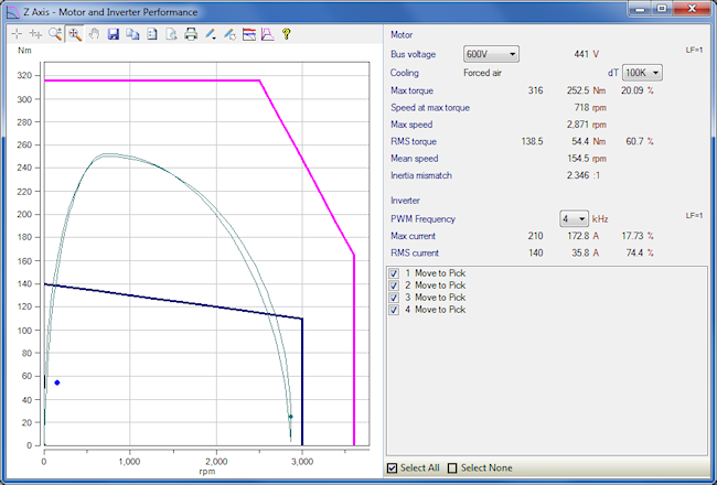 The remarkable result here is that the same move time of 705ms is achieved, using 252.5Nm of motor torque (slightly less than before), but using 54.3kW of infeed bus peak power instead of 74.7kW. This is a 27% reduction in bus peak power compared to the existing S-curved motion profile.