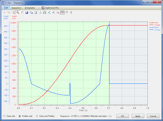 This article considers a real world pick and place robot application where the Axis 1 (the robot Z axis) must be as quick as possible for a given stroke. The existing S-curved motion profile traversed 1929mm in 705ms, requiring 255.2Nm of motor torque and over 74.7kW of infeed bus peak power. The maximum jerk value was 365m/s³, which was the empirically determined mechanical stiffness limit of the system.