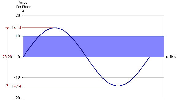 RMS indicates the power available from current. For sinusoidal brushless motors, the RMS rating is 70%, (1/v2) of the maximum current rating. So, an inverter that is rated at 10A RMS continuous could be rated at 28.28A Max peak-to-peak (10A x v2 x 2 = 28.28A), even though both drives produce the same amount of current. SERVOsoft uses the rms effective current rating of 10A RMS, which is most common among servo system vendors. The following graph best illustrates the differences: