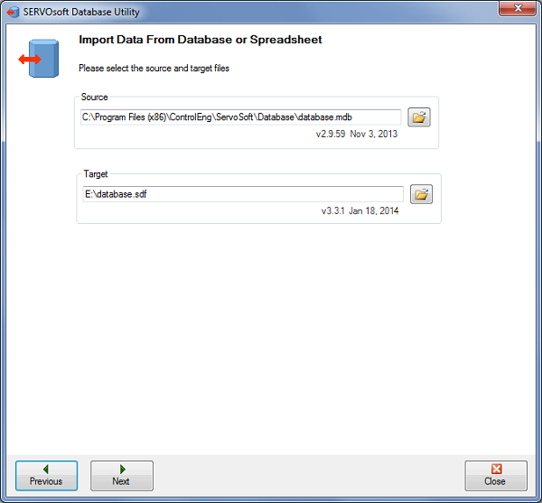 Then select the Source and Target files. The source file can be a v2, v3 or v4 database spreadsheet (see here), or a v2 database (.mdb), 3.2 database (.vdb4) or a v3.3 / v4.x database (.sdf). The target must always be the latest v4.x database file. Ie. Always importing from older to newer.