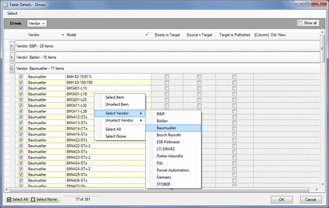 Image below shows how the user can right-click and select all 'Baumueller' drives...