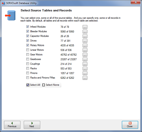 The next step allows the user to choose from the source file, specific tables, and products within those tables to include or exclude in the import process. By clicking the ".." button beside each table, the user can open the specific table of products and choose which products to include or exclude.