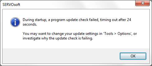 It means that SERVOsoft is not able to check for a program or database update. The underlying cause is that SERVOsoft is not able to download files from the Internet. So an update check is not possible and times out. This is usually caused by one of 2 possibilities.