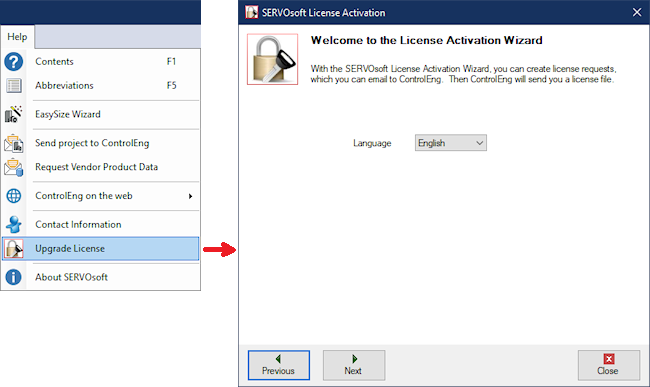 To install SERVOsoft, simply run the installation file. Once installed, launch the License Activation Wizard, and follow the steps to create and send a license request email to ControlEng.