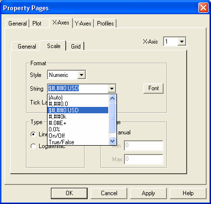 Number formatting allows many different styles to be displayed on any x or y-axis.  The format string is defined by codes as outlined in the tables below, taken directly from Microsoft's MSDN library for Visual Studio 6.