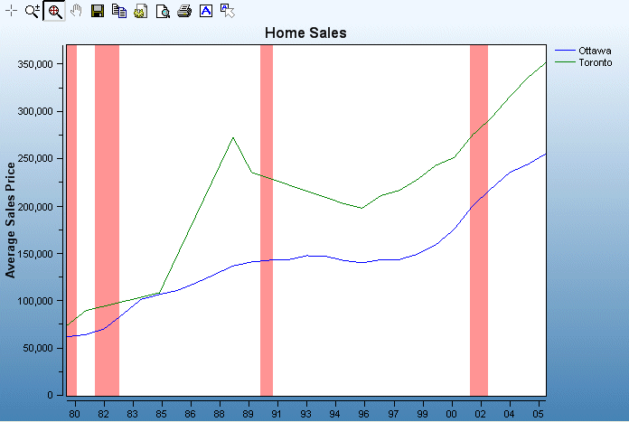 Private Sub Form1_Load(ByVal sender As System.Object, ByVal e As System.EventArgs) Handles MyBase.Load Dim DataArray(,) As Double Dim DataOttawa(,) As Double Dim DataToronto(,) As Double Dim dDate As DateTime = New DateTime(1980, 1, 1) Dim myFont As New Font("Arial", 12, FontStyle.Bold) Dim myFont2 As New Font("Arial", 10, FontStyle.Bold) ' Define the shaded periods, i.e. start and end dates, for the Recession profile ReDim DataArray(7, 1) DataArray(0, 0) = dDate.ToOADate DataArray(1, 0) = dDate.AddMonths(6).ToOADate DataArray(2, 0) = dDate.AddMonths(18).ToOADate DataArray(3, 0) = dDate.AddMonths(34).ToOADate DataArray(4, 0) = dDate.AddMonths(126).ToOADate DataArray(5, 0) = dDate.AddMonths(134).ToOADate DataArray(6, 0) = dDate.AddMonths(262).ToOADate DataArray(7, 0) = dDate.AddMonths(274).ToOADate ' Data for Profile 0 - Ottawa data ReDim DataOttawa(26, 1) DataOttawa(0, 0) = dDate.ToOADate DataOttawa(0, 1) = 62748 DataOttawa(1, 0) = dDate.AddMonths(12).ToOADate DataOttawa(1, 1) = 64896 DataOttawa(2, 0) = dDate.AddMonths(24).ToOADate DataOttawa(2, 1) = 71080 DataOttawa(3, 0) = dDate.AddMonths(36).ToOADate DataOttawa(3, 1) = 86245 DataOttawa(4, 0) = dDate.AddMonths(48).ToOADate DataOttawa(4, 1) = 102084 DataOttawa(5, 0) = dDate.AddMonths(60).ToOADate DataOttawa(5, 1) = 107306 DataOttawa(6, 0) = dDate.AddMonths(72).ToOADate DataOttawa(6, 1) = 111643 DataOttawa(7, 0) = dDate.AddMonths(84).ToOADate DataOttawa(7, 1) = 119612 DataOttawa(8, 0) = dDate.AddMonths(96).ToOADate DataOttawa(8, 1) = 128434 DataOttawa(9, 0) = dDate.AddMonths(108).ToOADate DataOttawa(9, 1) = 137455 DataOttawa(10, 0) = dDate.AddMonths(120).ToOADate DataOttawa(10, 1) = 141438 DataOttawa(11, 0) = dDate.AddMonths(132).ToOADate DataOttawa(11, 1) = 143361 DataOttawa(12, 0) = dDate.AddMonths(144).ToOADate DataOttawa(12, 1) = 143868 DataOttawa(13, 0) = dDate.AddMonths(156).ToOADate DataOttawa(13, 1) = 148129 DataOttawa(14, 0) = dDate.AddMonths(168).ToOADate DataOttawa(14, 1) = 147543 DataOttawa(15, 0) = dDate.AddMonths(180).ToOADate DataOttawa(15, 1) = 143193 DataOttawa(16, 0) = dDate.AddMonths(192).ToOADate DataOttawa(16, 1) = 140534 DataOttawa(17, 0) = dDate.AddMonths(204).ToOADate DataOttawa(17, 1) = 143873 DataOttawa(18, 0) = dDate.AddMonths(216).ToOADate DataOttawa(18, 1) = 143953 DataOttawa(19, 0) = dDate.AddMonths(228).ToOADate DataOttawa(19, 1) = 149650 DataOttawa(20, 0) = dDate.AddMonths(240).ToOADate DataOttawa(20, 1) = 159511 DataOttawa(21, 0) = dDate.AddMonths(252).ToOADate DataOttawa(21, 1) = 175971 DataOttawa(22, 0) = dDate.AddMonths(264).ToOADate DataOttawa(22, 1) = 200711 DataOttawa(23, 0) = dDate.AddMonths(276).ToOADate DataOttawa(23, 1) = 218692 DataOttawa(24, 0) = dDate.AddMonths(288).ToOADate DataOttawa(24, 1) = 235678 DataOttawa(25, 0) = dDate.AddMonths(300).ToOADate DataOttawa(25, 1) = 244531 DataOttawa(26, 0) = dDate.AddMonths(312).ToOADate DataOttawa(26, 1) = 255889 ' Data for Profile 1 - Toronto data ReDim DataToronto(16, 1) DataToronto(0, 0) = dDate.ToOADate DataToronto(0, 1) = 75000 DataToronto(1, 0) = dDate.AddMonths(12).ToOADate DataToronto(1, 1) = 90203 DataToronto(2, 0) = dDate.AddMonths(60).ToOADate DataToronto(2, 1) = 109000 DataToronto(3, 0) = dDate.AddMonths(108).ToOADate DataToronto(3, 1) = 273000 DataToronto(4, 0) = dDate.AddMonths(120).ToOADate DataToronto(4, 1) = 235983 DataToronto(5, 0) = dDate.AddMonths(180).ToOADate DataToronto(5, 1) = 203028 DataToronto(6, 0) = dDate.AddMonths(192).ToOADate DataToronto(6, 1) = 198150 DataToronto(7, 0) = dDate.AddMonths(204).ToOADate DataToronto(7, 1) = 211307 DataToronto(8, 0) = dDate.AddMonths(216).ToOADate DataToronto(8, 1) = 216815 DataToronto(9, 0) = dDate.AddMonths(228).ToOADate DataToronto(9, 1) = 228372 DataToronto(10, 0) = dDate.AddMonths(240).ToOADate DataToronto(10, 1) = 243255 DataToronto(11, 0) = dDate.AddMonths(252).ToOADate DataToronto(11, 1) = 251508 DataToronto(12, 0) = dDate.AddMonths(264).ToOADate DataToronto(12, 1) = 275371 DataToronto(13, 0) = dDate.AddMonths(276).ToOADate DataToronto(13, 1) = 293067 DataToronto(14, 0) = dDate.AddMonths(288).ToOADate DataToronto(14, 1) = 315231 DataToronto(15, 0) = dDate.AddMonths(300).ToOADate DataToronto(15, 1) = 335907 DataToronto(16, 0) = dDate.AddMonths(312).ToOADate DataToronto(16, 1) = 351941 ' Configure XYChart control With XyChartNETCtl1 .NumProfiles = 3 .NumXScales = 1 .NumYScales = 1 With .Title .Label = "Home Sales" .Font = myFont End With With .Toolbar .BackColor = Color.AliceBlue End With With .Gradient .GradientOption = XYChartNet.XYChartNETCtl.GradientOptions.goCustom .StartColor = Color.AliceBlue .EndColor = Color.SteelBlue .Orientation = XYChartNet.XYChartNETCtl.OrientationOptions.ooVertical End With With .Plot.Border .LineWidth = XYChartNet.XYChartNETCtl.WidthOptions.woOnePoint .LineOption = XYChartNet.XYChartNETCtl.LineOptions.loCustom .LineColor = Color.Black End With ' Format grid lines With .XAxis(0).Grid .LineOption = XYChartNet.XYChartNETCtl.LineOptions.loNone .LineColor = Color.Green End With With .YAxis(0).Grid .LineOption = XYChartNet.XYChartNETCtl.LineOptions.loNone .LineColor = Color.Green End With ' X Scale With .XAxis(0).Scale .LabelColor = Color.Black .TicksColor = Color.Black .FormatStyle = XYChartNet.XYChartNETCtl.FormatStyles.fsDateTime .DateTimeFormat = "yy" .Label = "" End With ' Y Scale 0 With .YAxis(0).Scale .Visible = True .LabelColor = Color.Black .TicksColor = Color.Black .LabelVertical = "Average Sales Price" .LabelVerticalFont = myFont2 End With ' Format Profile 0 With .Profile(0) .Label = "Recession" .YScale = 0 .NumSamples = 8 .MarkerOption = XYChartNet.XYChartNETCtl.LineOptions.loNone .LineOption = XYChartNet.XYChartNETCtl.LineOptions.loNone .ChartFeatureType = XYChartNet.XYChartNETCtl.ChartFeatureOptions.cfRecession .FillEnabled = True .FillColor = Color.Red .RecessionLimitsMode = XYChartNet.XYChartNETCtl.RecessionModes.rmAuto .DisplayInLegend = False End With ' Format Profile 1 With .Profile(1) .Label = "Ottawa" .YScale = 0 .NumSamples = 27 .LineColor 
