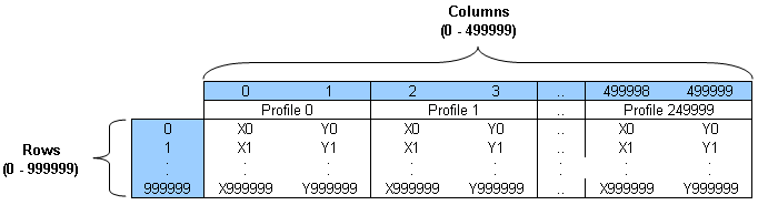 All arrays are 0-based. The maximum number of profiles is 250000. Every point in every profile requires an X and Y value. Hence, the maximum number of columns is 2 x 250000 profiles = 500000 columns. The maximum number of samples per profile is 1000000. Therefore, the maximum size of the ChartData array is 500000 columns x 1000000 rows (see table below).