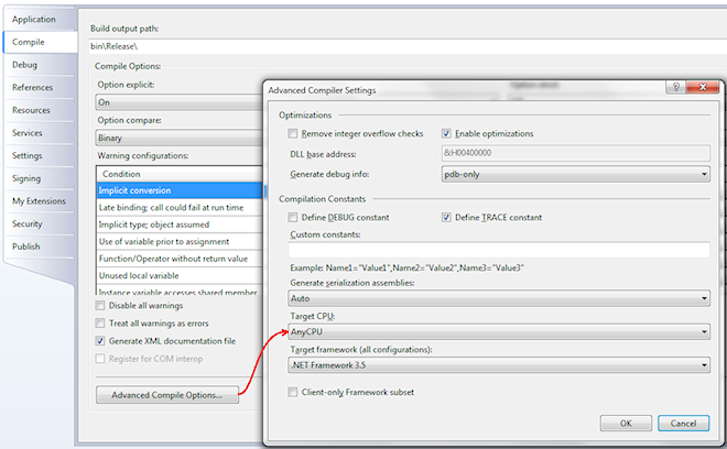 Solution: Open the project properties, select the "Compile" tab, then click on the "Advanced Compile Options" button. Set the Target CU to x86, per the screenshot below.